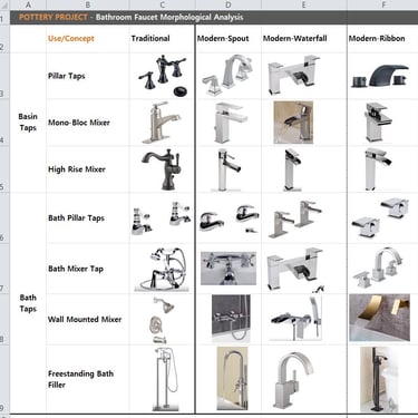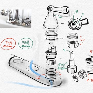 Since taps were not my area of expertise, I explored existing inner structures and designs of taps. And then, I classified them into two major categories, cylinder type & ball type. Ball-type is mainly used for Mono taps, while Cylinder-type is used for faucets with the tap separating both handles. There were a few physically restrictive aspects, such as the standard size of components.
